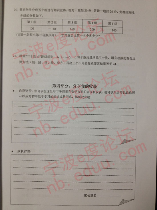 2013年宁外数学暑假作业 涉及初一知识点(14)