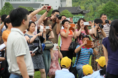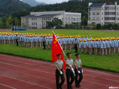 全体班级在操场上走过之后,在草坪上每个班级的学生笔挺的站着。这时候三个教官拿着五星红旗,以军人的姿态缓缓从主席台走过。