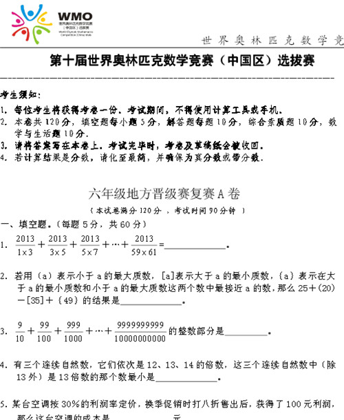 以下为2013年世奥赛复赛六年级A卷试题