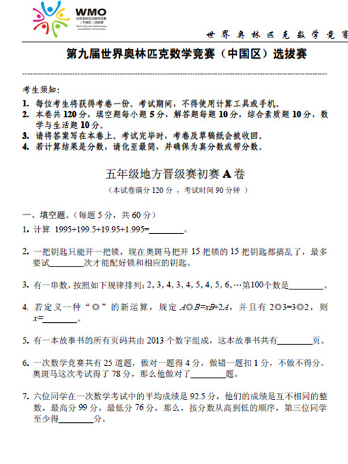 以下为2012年第九届世奥赛初赛五年级A卷试题
