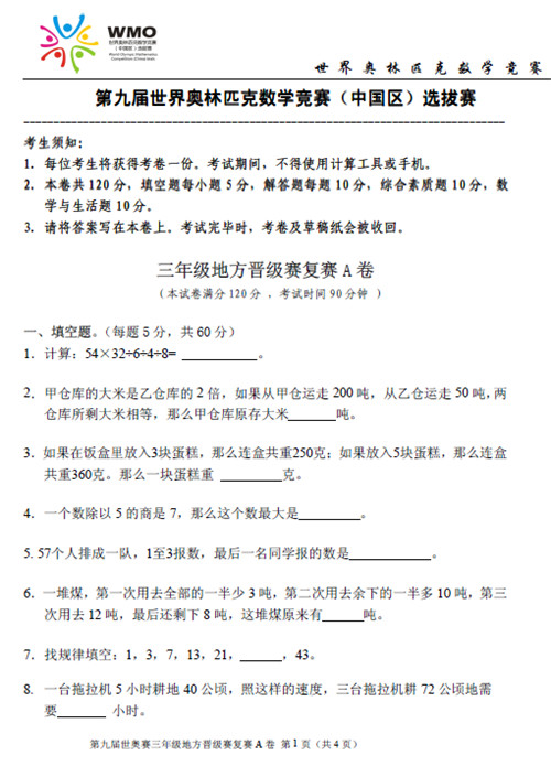 以下为2012年第九届世奥赛复赛三年级A卷试题