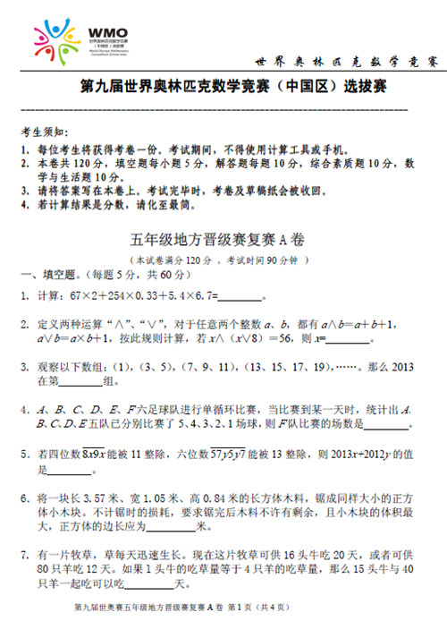 以下为2012年第九届世奥赛复赛五年级A卷试题