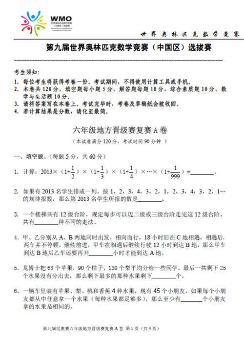 以下为2012年第九届世奥赛复赛六年级A卷试题