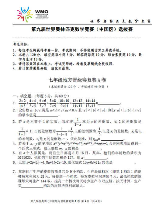 以下为2012年第九届世奥赛复赛七年级A卷试题