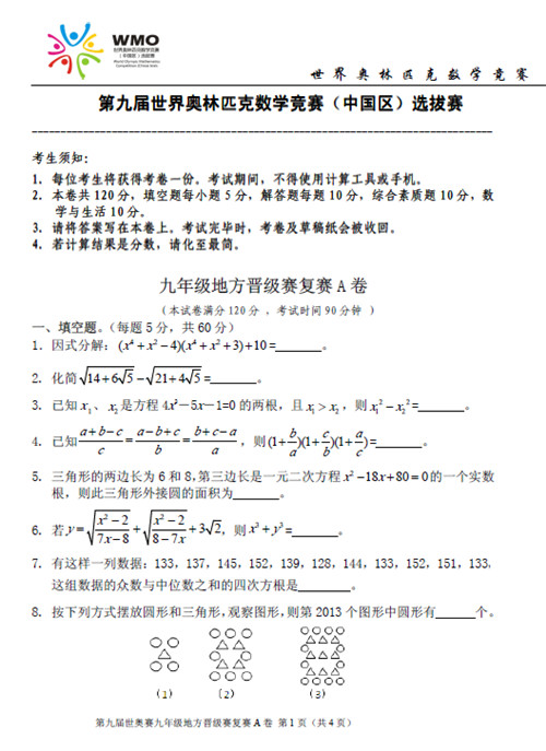 以下为2012年第九届世奥赛复赛九年级A卷试题