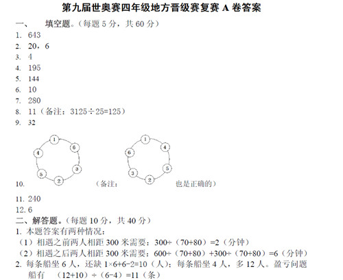 以下为2012年第九届世奥赛复赛四年级A卷试题答案