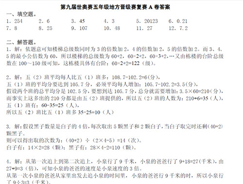 2012年第九届世奥赛地方晋级赛复赛五年级A卷答案