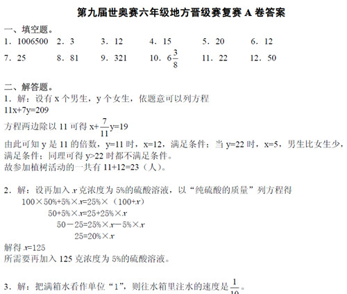 以下为2012年第九届世奥赛复赛六年级A卷试题答案