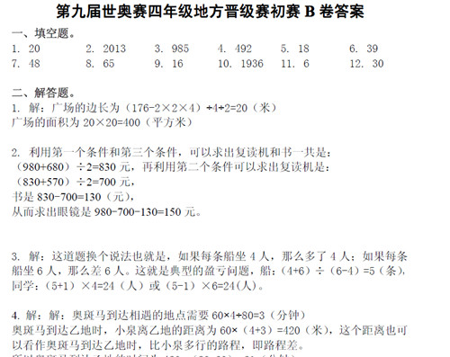2012年第九届世奥赛地方晋级赛初赛四年级B卷答案