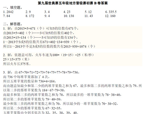 2012年第九届世奥赛地方晋级赛初赛五年级B卷答案