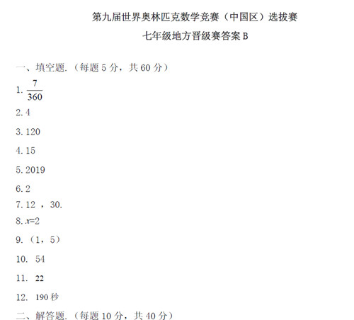 2012年第九届世奥赛地方晋级赛初赛七年级B卷答案