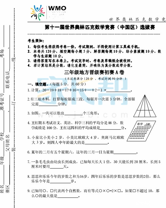 2014年第十一届世奥赛初赛试卷-三年级A卷 宁波奥数网 2014-08-08 18:35:02 宁波奥数网讯:2014年第十一届世奥赛在上海已经顺利闭幕,小编将世奥赛的初赛、复赛的真题进行了汇总,希望相关同学家长及时查看。 首页 上一页 下一页 尾页