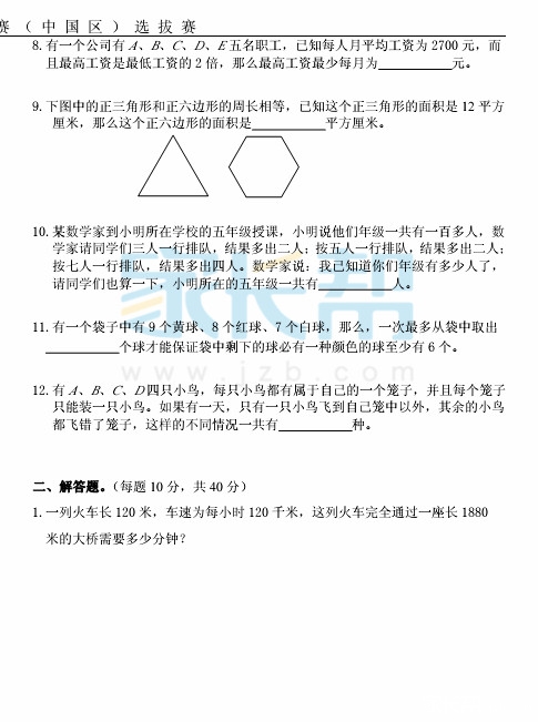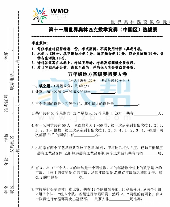 2014年第十一届世奥赛初赛试卷-五年级A卷 宁波奥数网 2014-08-08 18:40:18 宁波奥数网讯:2014年第十一届世奥赛在上海已经顺利闭幕,小编将世奥赛的初赛、复赛的真题进行了汇总,希望相关同学家长及时查看。 首页 上一页 下一页 尾页