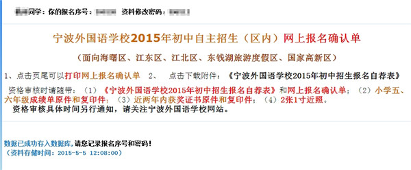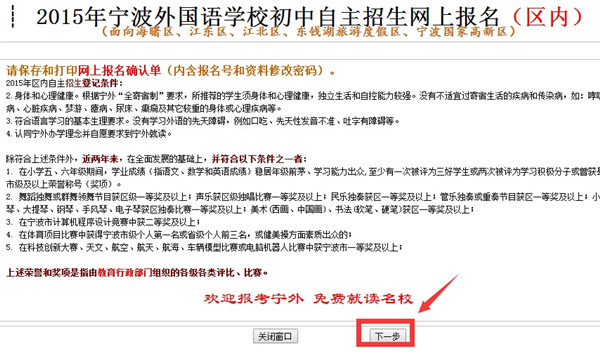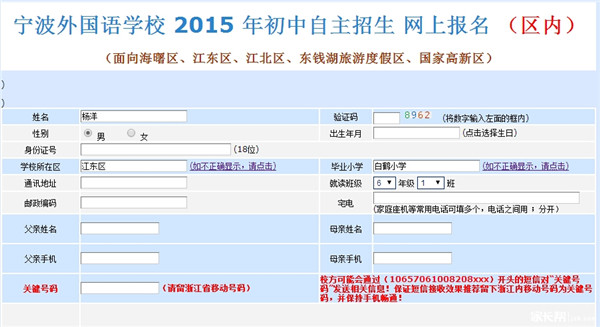 2015年宁波外国语学校初中自主招生网上报名(区内)