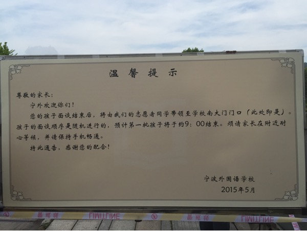 警戒线处,有一个公告板,表明这次面谈顺序是随机的,预计第一批孩子将于九点结束面谈。