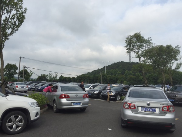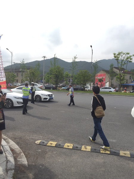 镜头倒退到路口,看交警叔叔门指挥,停车场已满,在交警指挥下,后来的车辆陆续停至路口。