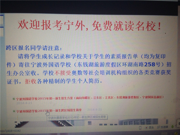 宁波奥数网:2015宁波小升初进行时,这几天,宁外、蛟川、蓝青、兴宁、科中在宁波教科网上进行跨区报名(报名截止时间:5月19日17:00),有家长反映:宁波区外宁外的家长们:要寄资料哦!