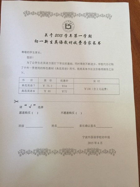 宁波外国语2015年新初一英语教材收费告家长书