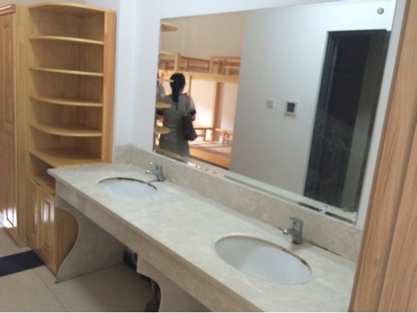一个寝室六个床位,六个柜子,两盏灯,一个电扇,一个空调,一个电话,一个卫生间,两个盥洗盆,两个便池,两个淋浴头