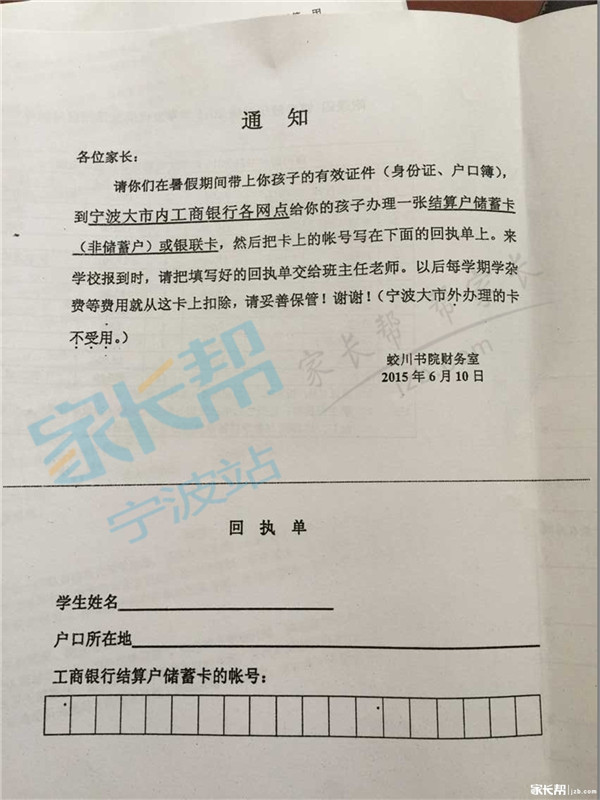2015宁波蛟川书院新生开学:工行卡办理通知