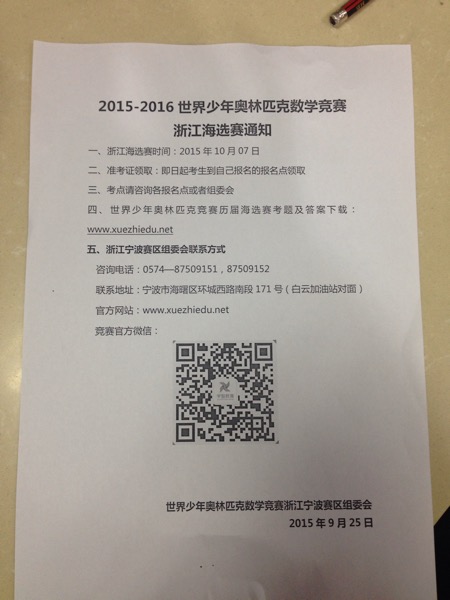 宁波奥数网:2015-2016宁波世少赛初赛准考证可以领取了!