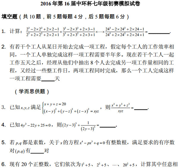 点击下载>>>>2016年中环杯初一年级初赛模拟卷(完整版)
