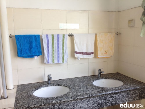 3.洗漱台:2个水龙头。上面还可以放洗脸的毛巾,这个宿舍可以照到阳光哦,每天阳光撒到毛巾上,杀菌杀菌,嘿嘿。家长们担心小伙伴弄脏了柜子,把洗衣服的肥皂放在了窗台上,好贴心,考虑的好仔细哦。