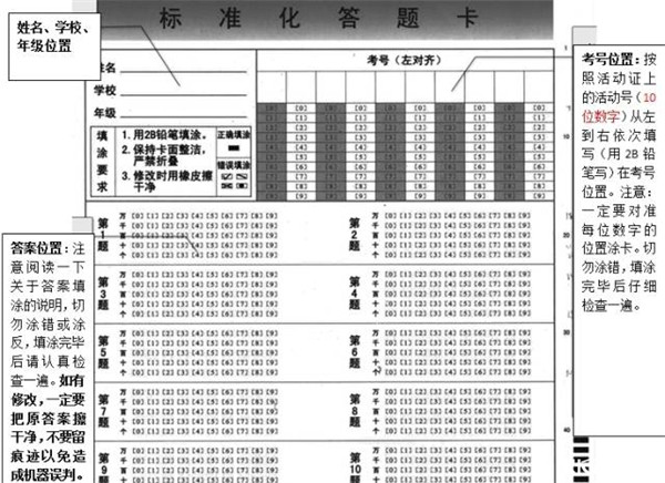 如答案为10,则需要将十位涂【1】、个位涂【0】这样读出来就是10.(切记:万位、千位、百位没有数字所以空白不涂即可,个位的0一定要填涂)。