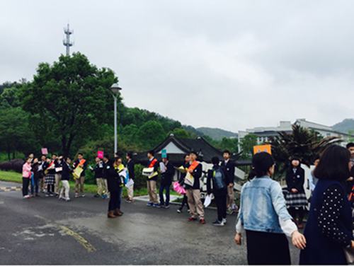 小升初的家长需前往音乐厅,沿途可以看到小志愿者站在路两侧为家长指引