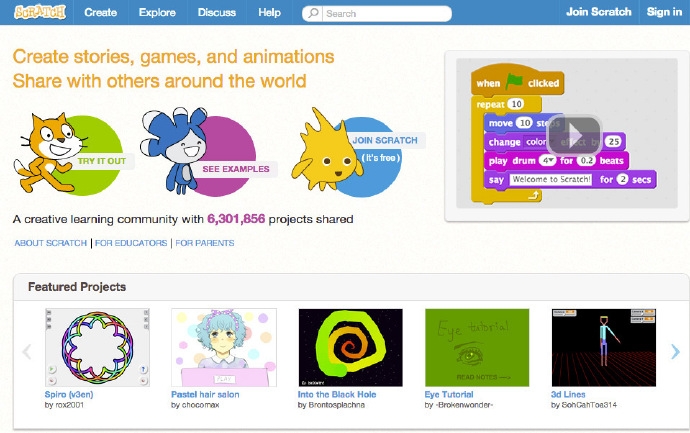 Scratch是由麻省理工学院媒体实验室LifelongKindergarten小组开发的一种编程语言和在线社区。Scratch的服务是免费的,它允许你的孩子创建自己的动画,游戏和故事。你的孩子可以通过Scratch的在线社区与世界各地的其他人一同分享创造的成果。