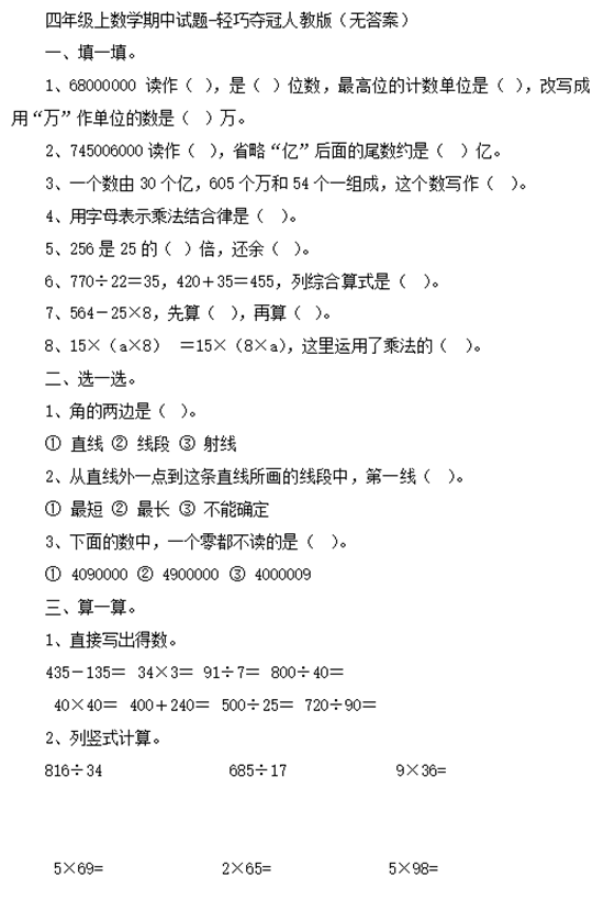 宁波奥数网:宁波小学四年级期中考试马上就要到了,大家也开始为期中考试着手复习。宁波奥数网小编为大家整理了一些四年级人教版小学试题。希望对大家有所帮助。