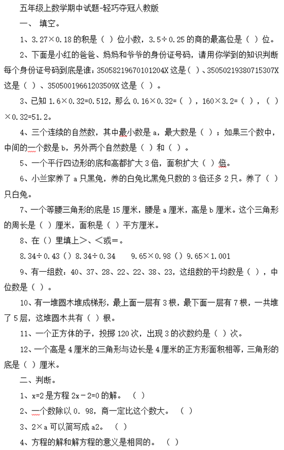 宁波奥数网:宁波小学五年级期中考试马上就要到了,大家也开始为期中考试着手复习。宁波奥数网小编为大家整理了一些五年级人教版小学试题。希望对大家有所帮助。
