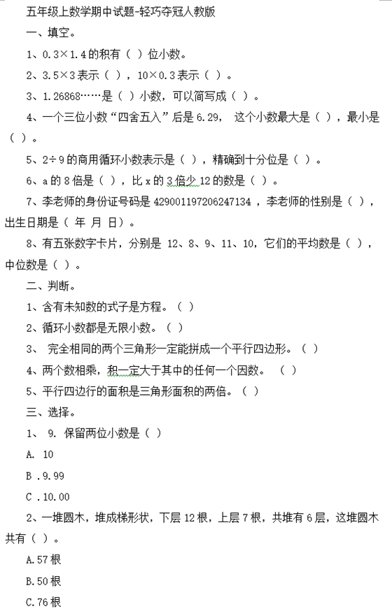 宁波奥数网:宁波小学五年级期中考试马上就要到了,大家也开始为期中考试着手复习。宁波奥数网小编为大家整理了一些五年级人教版小学试题。希望对大家有所帮助。