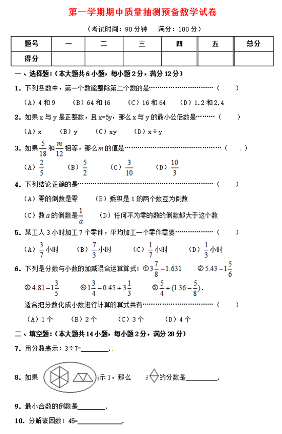 宁波小学六年级上册数学期中试题(三)