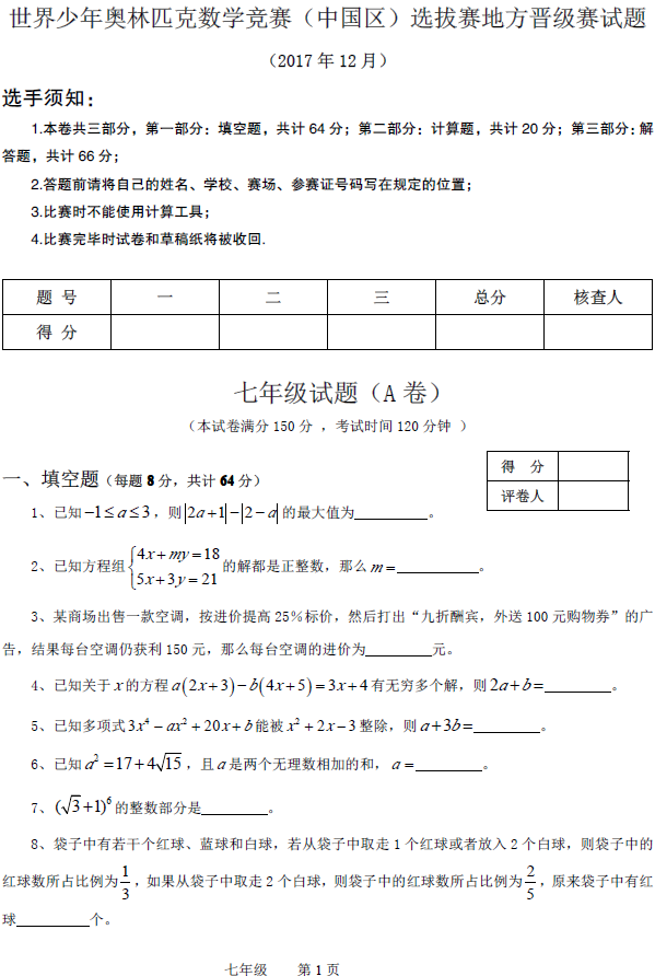 2017年宁波世少赛晋级赛七年级试卷