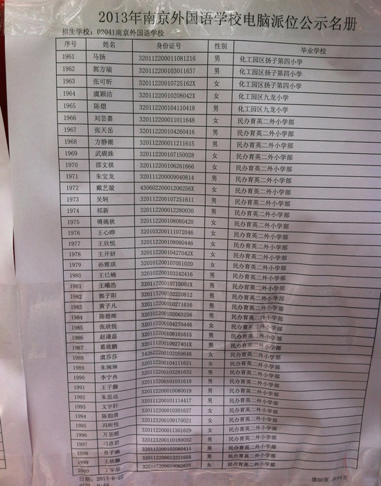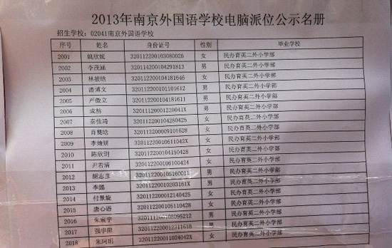 2013年南京外国语学校电脑派位公示名单---原浦口区(7) 南京奥数网整理 2013-06-22 16:07:08 >>2013年南京外国语学校电脑派位公示名单---原下关区 【相关阅读】 2013年南外摇号现场花絮 “南外梦”牵动众人心弦 2013年南外报名电脑派位共3324人 创近四年最低 2013年南外摇号现场播报 家长代表全程监督电脑派位 南外电脑派位结果11时公布 23日英语综合能力测试报名 南外英语综合能力测试试题及答案汇总(2004年-2012年) 首页 上一页 下一页 尾页