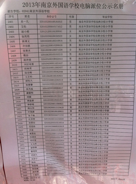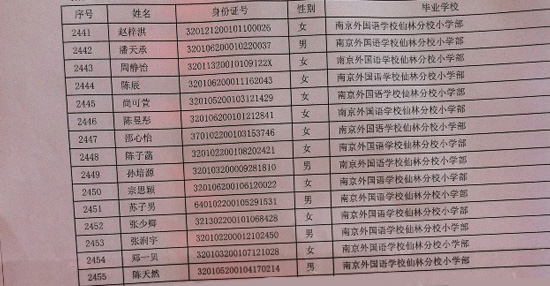 2013年南京外国语学校电脑派位公示名单---栖霞区(11) 南京奥数网整理 2013-06-22 16:28:46 >>2013年南京外国语学校电脑派位公示名单---原浦口区 【相关阅读】 2013年南外摇号现场花絮 “南外梦”牵动众人心弦 2013年南外报名电脑派位共3324人 创近四年最低 2013年南外摇号现场播报 家长代表全程监督电脑派位 南外电脑派位结果11时公布 23日英语综合能力测试报名 南外英语综合能力测试试题及答案汇总(2004年-2012年) 首页 上一页 下一页 尾页