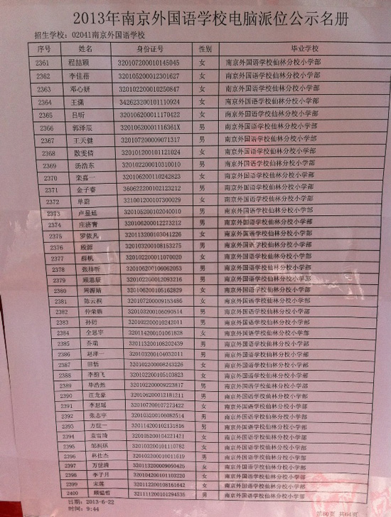 2013年南京外国语学校电脑派位公示名单---栖霞区(9)
