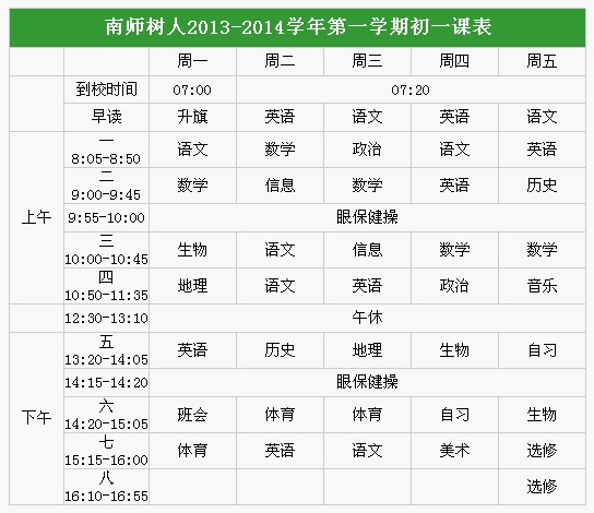 作息时间:周一上午7:00到校,周二~周五上午7:20到校,下午5:00放学。