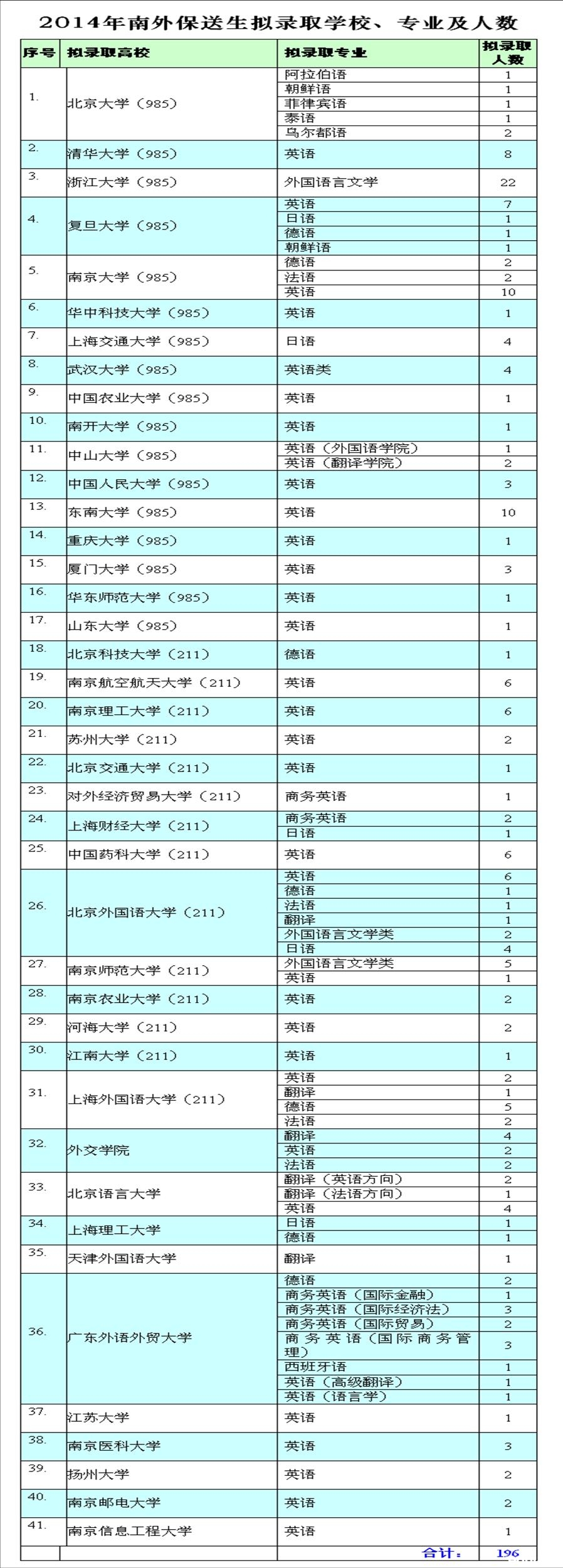 2014年南外保送生拟录取学校、专业及人数 家长帮社区 2014-05-27 11:12:09 南京奥数网讯:2014年南外保送生拟录取学校、专业及人数如下表,共计196人。 【查看原帖并参与讨论:2014年南外保送生拟录取学校、专业及人数】