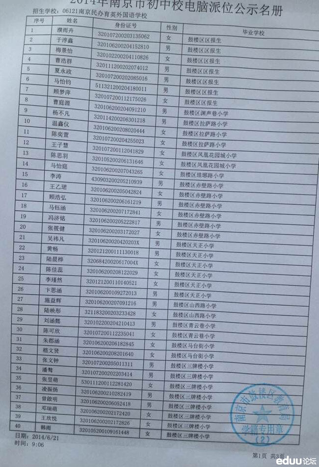 【e度首发】2014年南京育英外校小升初摇号名单(共120人)