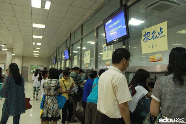 缴完费后向前走来到报名点,交验材料,领取测试证。