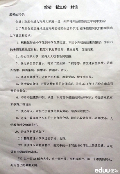 南京奥数网 为了帮助学生更好地适应南外的校园生活和学习,南京外国语学校给初一新生的一封信:2014级南外初一新生暑期生活指导学习要求,供大家参考学习。