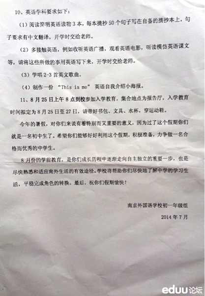 2014级南外初一新生暑期生活指导学习要求 (2) 南京e度论坛 2014-07-17 16:30:11 2014级南外初一新生暑期生活指导学习要求 编辑推荐: 2014年南外小升初录取名单(共322人) 南外录取通知书闪亮登场,祝贺322名南外学子 南外小升初322人上榜最高分考生是个“小作家” 首页 上一页 下一页 尾页