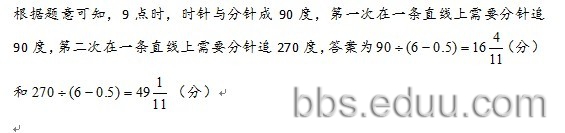 5、小红在9点与10点之间开始解一道数学题,当时时针和分针正好成一条直线,当小红解完这道题时,时针和分针刚好第一次重合,小红解这道题用了多少时间?