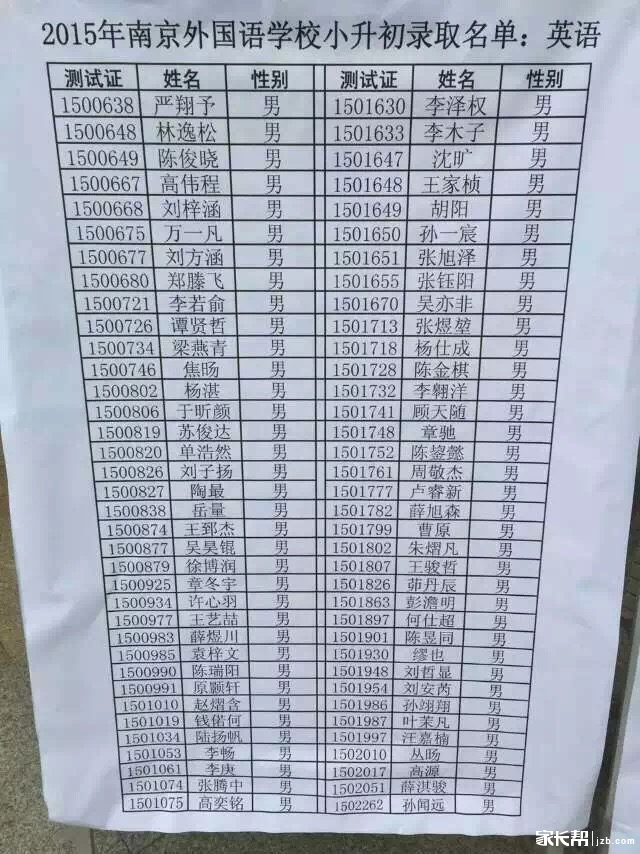 2015年南京外国语学校小升初英语能力测试录取名单正式公布: