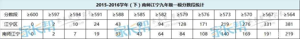 附:2015-2016学年(下)南师江宁九年级一模分数段统计