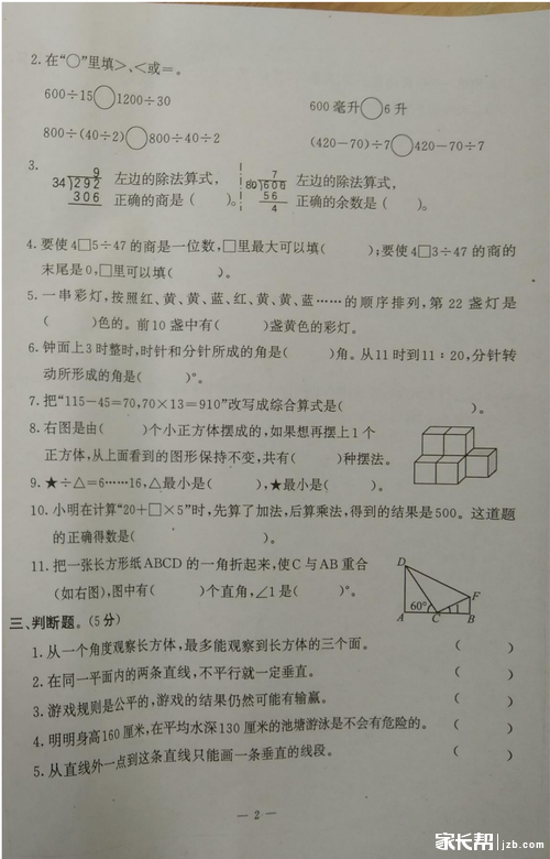 2019年南京市江宁区小学四年级数学期末卷(图片版)(2)