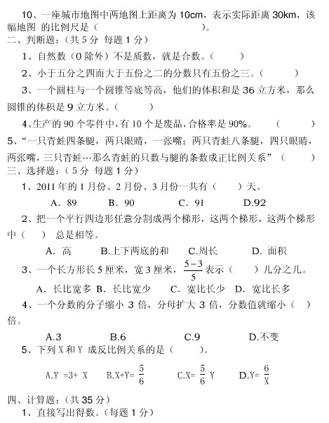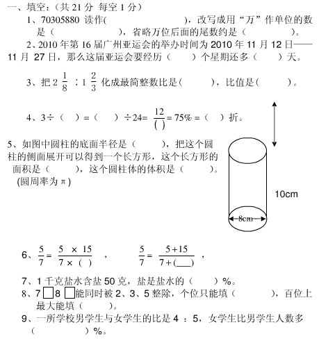 2012青岛小升初 小学六年级数学毕业考试题 (附答案)
