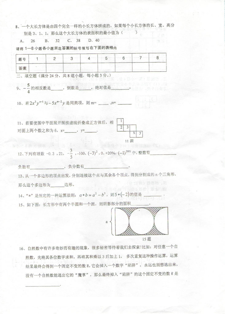 青岛59中2011-2012学年度七年级第一学期数学期中试题(2)
